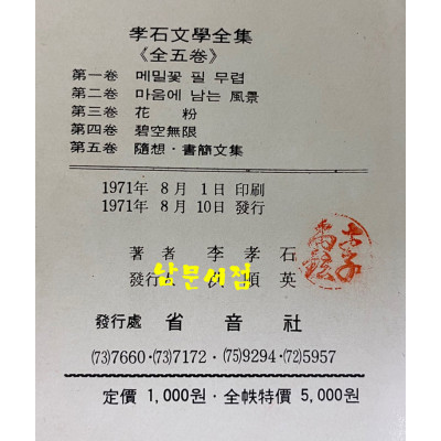 이효석전집 효석전집 1~5 전5권 완질 1971년 성음사판 요약정보 및 구매