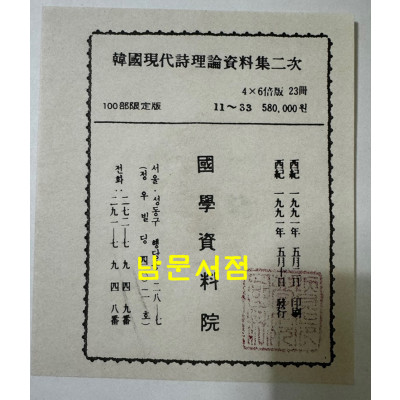 | 도서명 | 한국현대시이론자료집 2차분 전23권 완질 100부 한정판 1930년01월부터 1939년 12월까지 / 한국학진흥원 |